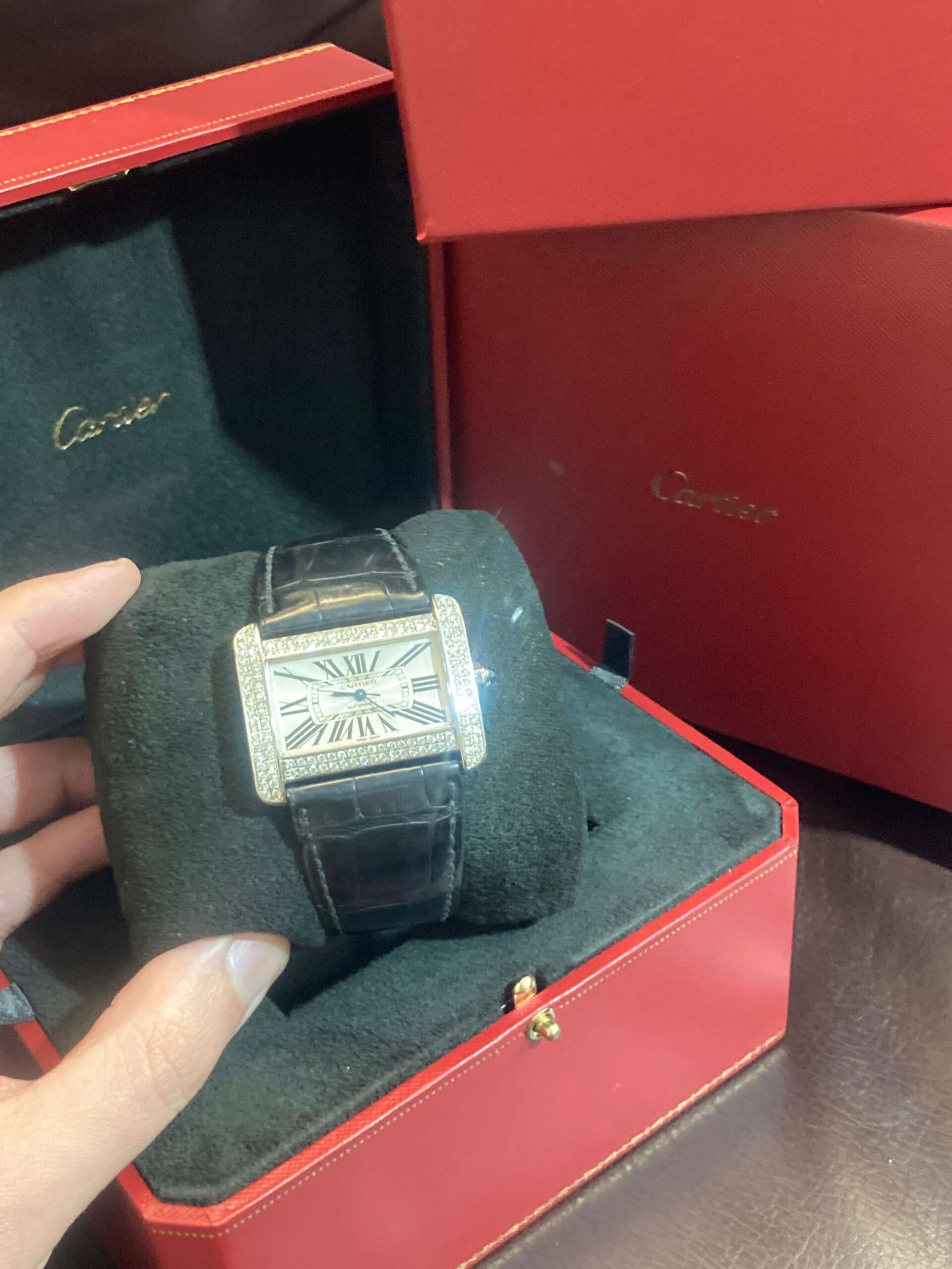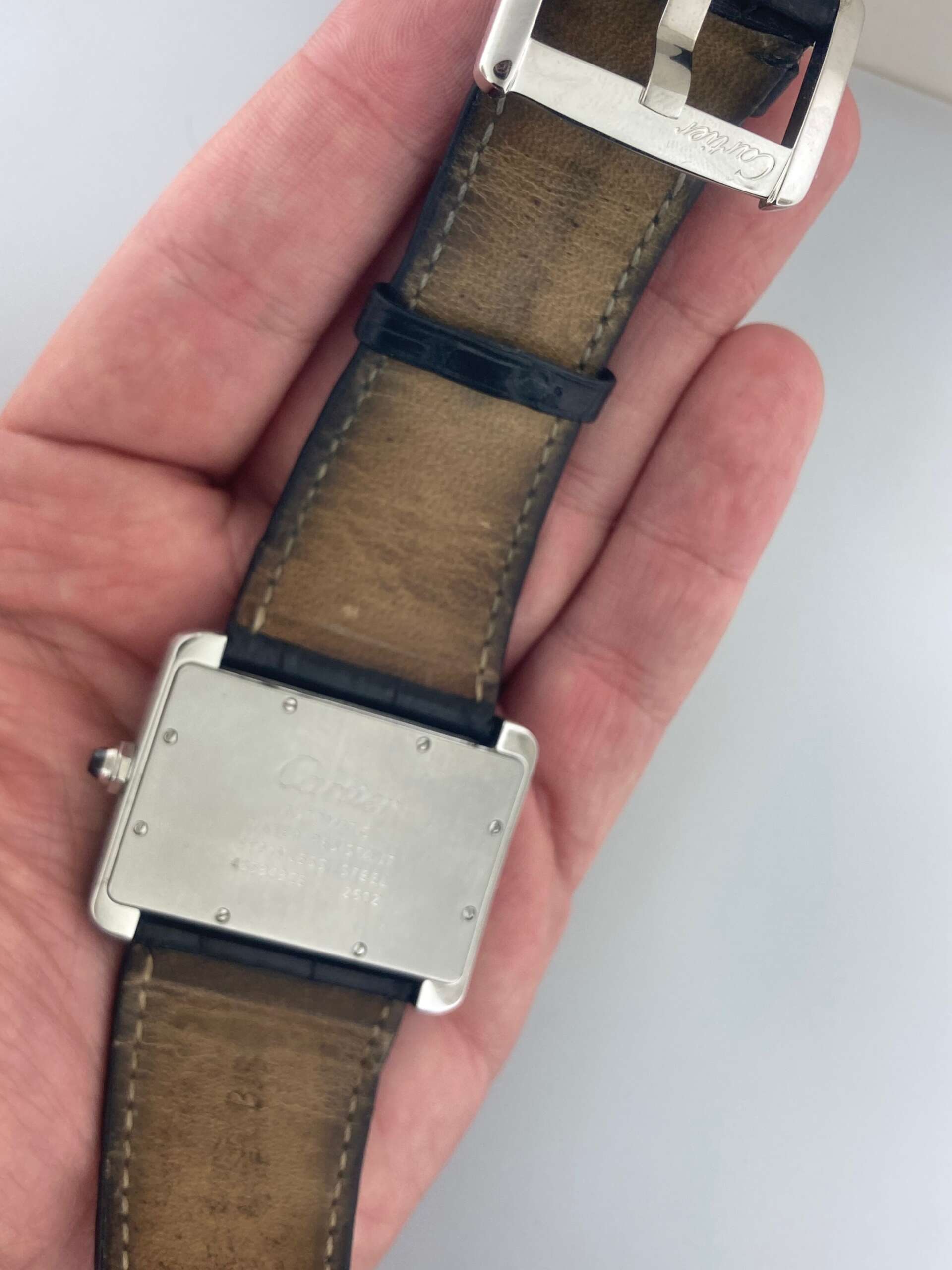 Original Cartier Two-Piece Used Worn Black Leather Strap Box and Papers: With Cartier Box