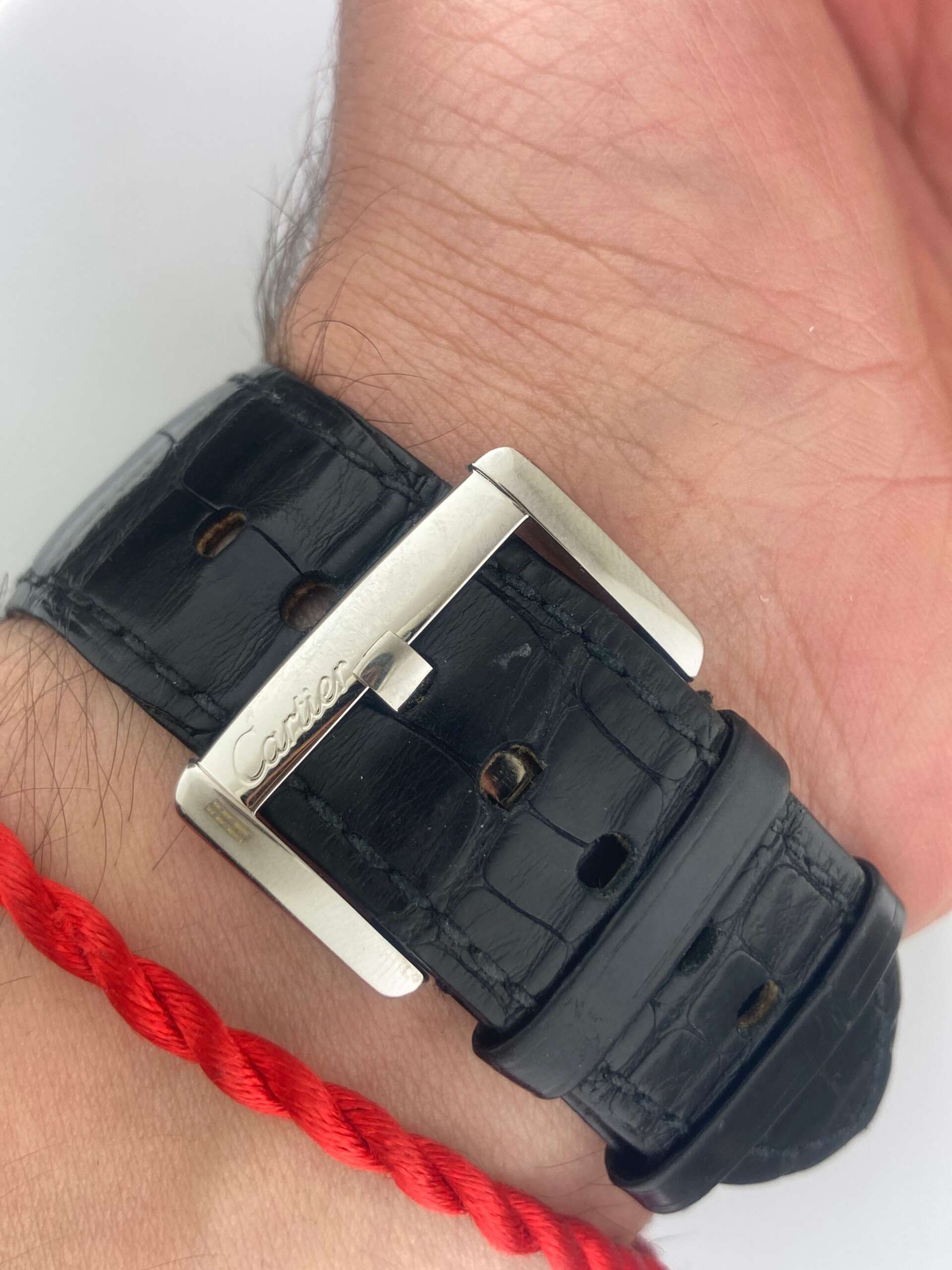 Bracelet/Strap: Original Cartier Two-Piece Used Worn Black Leather Strap Box and Papers: With Cartier Box