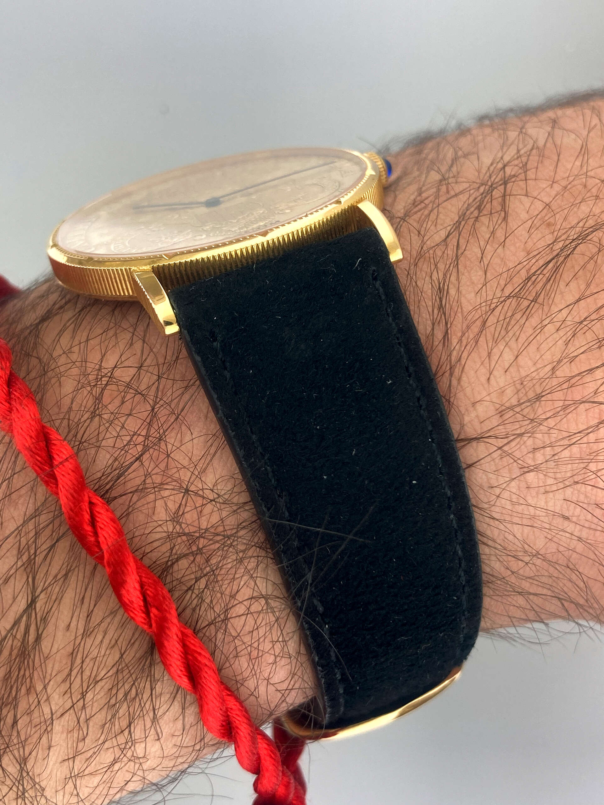 36mm Y ellow gold round case with 22k coin, 36mm in diameter. Coin-clipped edge. Fluted crown set with a blue sapphire cabochon.